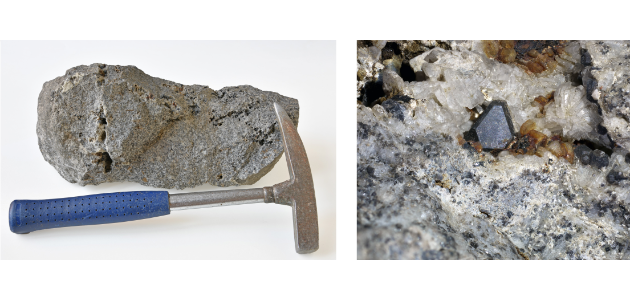Großer Nosean führender Sanidinit-Auswürfling mit Geologenhammer zum Größenvergleich, westliche Sandkaule nahe bei der Abtei Maria Laach, Mendig, Eifel, Rheinland-Pfalz, Deutschland, Slg. Karl Wilhelm Nose (Inv.-Nr. 2019_00064, Größe 31 x 12 x 15 cm). Diese Probe wird in den „Mineralogischen Studien über die Gebirge am Niederrhein“ von Johann Jacob Nöggerath auf Seite 114 erwähnt und auf den folgenden Seiten zur Beschreibung der Morphologie von Nosean verwendet. Die Ausschnittvergrößerung zeigt einen schwarz-grauen Nosean-Kristall neben weißem, tafeligen Sanidin (Höhe des Kristalls ca. 9 mm) von dieser Probe. |
