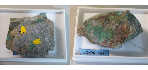 Metaheimite holotype (left) and metaheimite cotype (right). Size of boxes: 4 x 6 cm. |